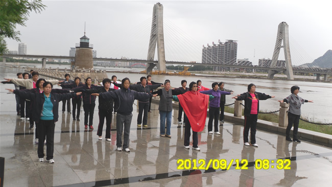 2012年9月12日,天空下著蒙蒙細(xì)雨,在遼寧朝陽大凌河畔照例響起了動(dòng)感的音樂,伴隨著節(jié)奏,有這樣一群中老年人,時(shí)而胳膊上揚(yáng),時(shí)而屈腿下蹲,時(shí)而左右擺動(dòng),時(shí)而前后擊掌……他們?cè)诟墒裁矗肯掠晏觳皇菓?yīng)該躲在家里看看電視、搓搓麻將、打打撲克嗎?為什么他們卻冒雨在明快節(jié)奏中舞動(dòng)……
