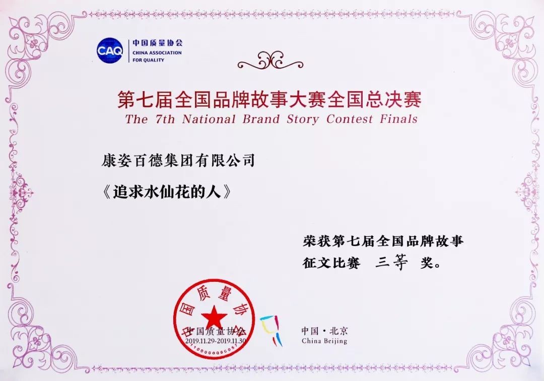 經(jīng)過(guò)全國(guó)27個(gè)分賽區(qū)、近約450個(gè)作品的激烈角逐和評(píng)選。康姿百德集團(tuán)憑借《追求水仙花的人》的主題征文、《質(zhì)量是企業(yè)的生命》的主題演講、《從科學(xué)家走向企業(yè)家的人生飛躍》的主題演講,從全國(guó)眾多的知名品牌故事中脫穎而出,分別斬獲了兩個(gè)三等獎(jiǎng),榮獲一項(xiàng)優(yōu)勝獎(jiǎng)。